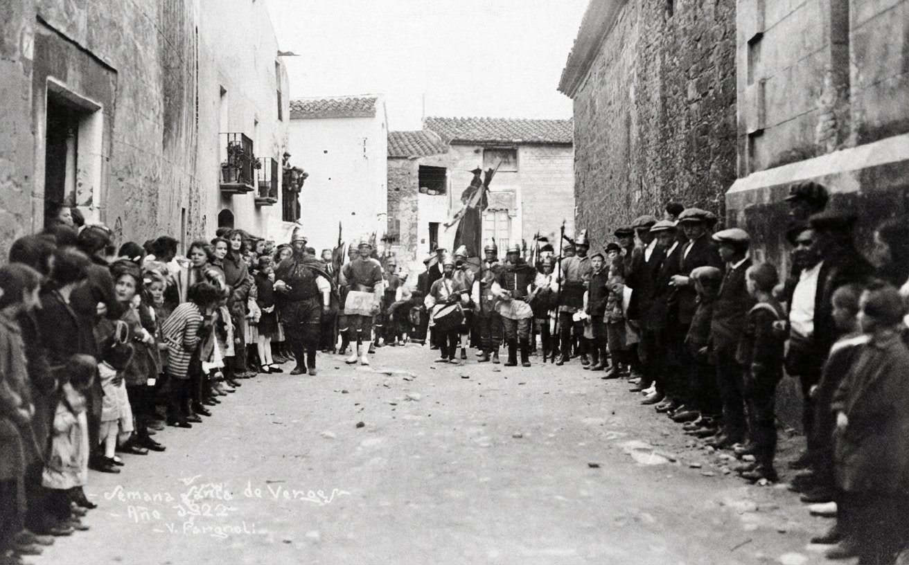 Detalle de los ‘manages’ (soldados romanos) en 1922. Los trajes, cascos y lanzas que aparecen en la imagen son los mismos que lograron sobrevivir escondidos durante todo el conflicto bélico. (Foto: V. Fargnoli. Restaurada digitalmente).